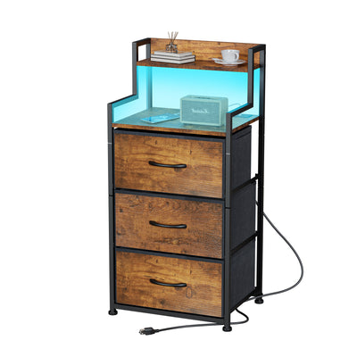 Tall Nightstand with Light and Charging Station 3 Fabric Drawers and Storage Shelf